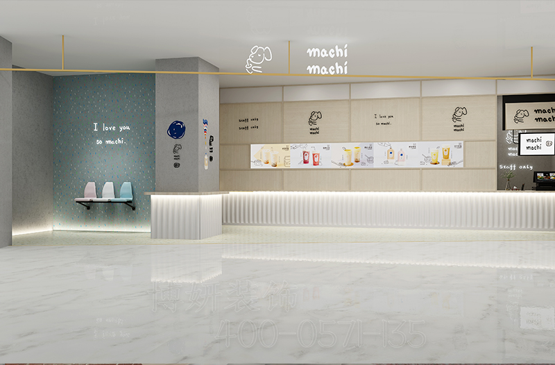 这是一家周杰伦奶茶店装修设计效果图。整体的装修设计非常的简约风格,浅黄色系加上简约的白色,非常的清新干净,令顾客会觉得这家店卫生可靠,给人一种心理上的暗示。