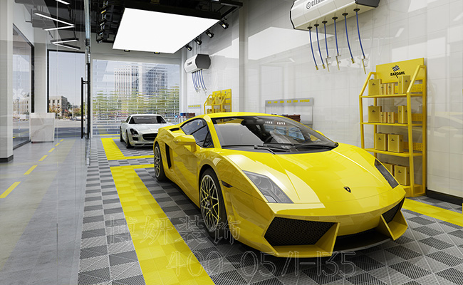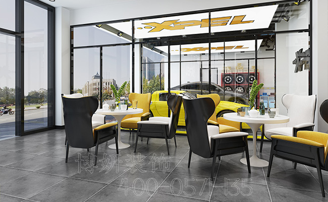 这家时尚的汽车美容中心装修设计图,看上去就非常的令人有信服感。整体上使用亮黄色和白色组做为主色调,非常的醒目,令车主一眼就能看出来这块区域的作用,清晰明了。